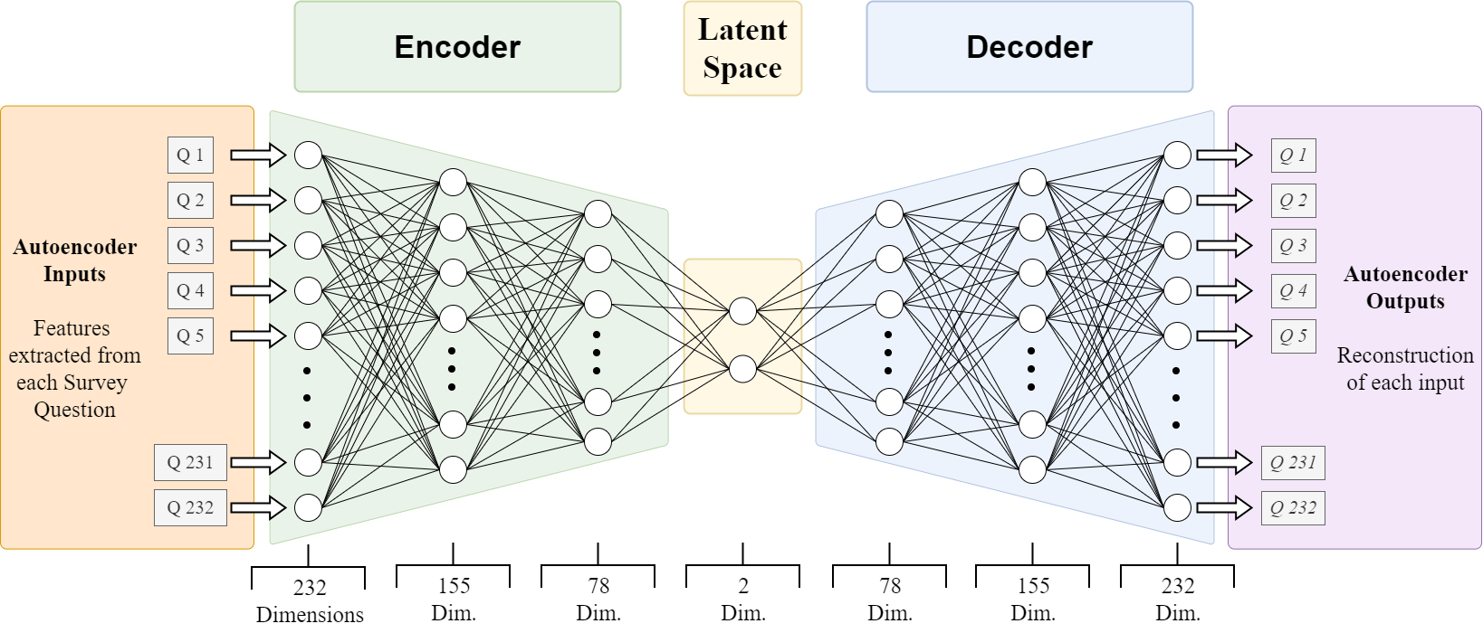To address the complexities of this data, an autoencoder framework was employed to extract low-dimensional latent representations of the survey responses. KMeans clustering was then applied to the latent spaces to identify distinct customer segments.