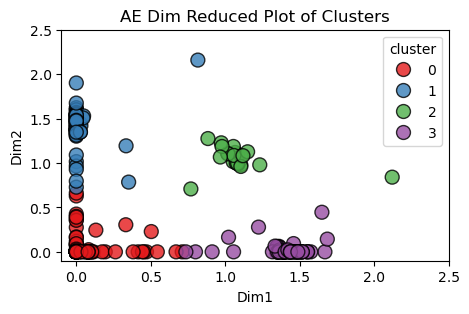 Below is a scatter plot of the reduced dimensions of the latent space with KMeans cluster assignments denoted by color. This is the output when using the entire combined dataset through the processes described above.
